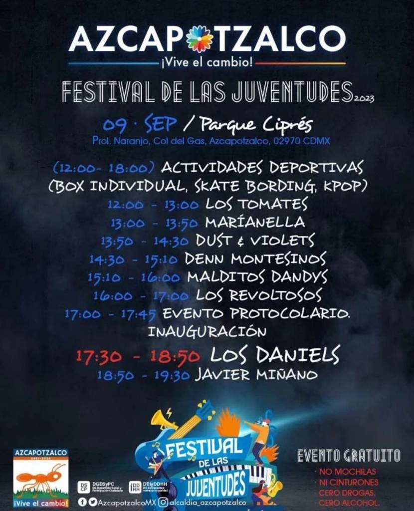 El Festival de las Juventudes 2023 tendrá como sede el Parque Ciprés en Azcapotzalco este sábado 9 de Septiembre, en dónde además de diferentes actividades deportivas y culturales, contará con la presencia de diferentes bandas de rock, entre ellos, Los Daniels, un grupo que marcó toda una generación con sus peculiares canciones y estilo.
